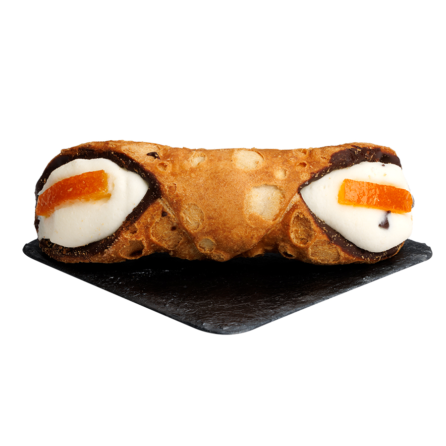 Croccante biscotto di pasta frolla, farcito con semifreddo al mango e cuore di cremoso al passion fruit.