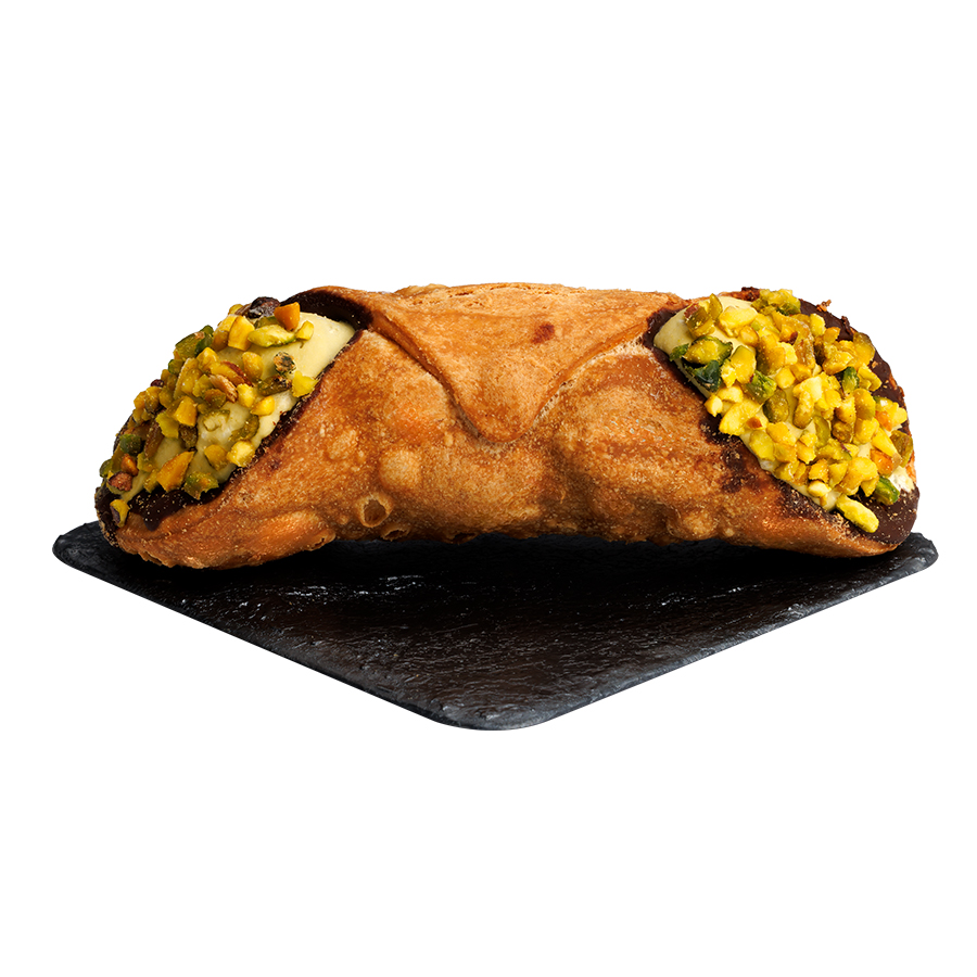 Morbido bisquit alla panna, mousse allo yogurt e tenero inserto all'arancia e al pistacchio.