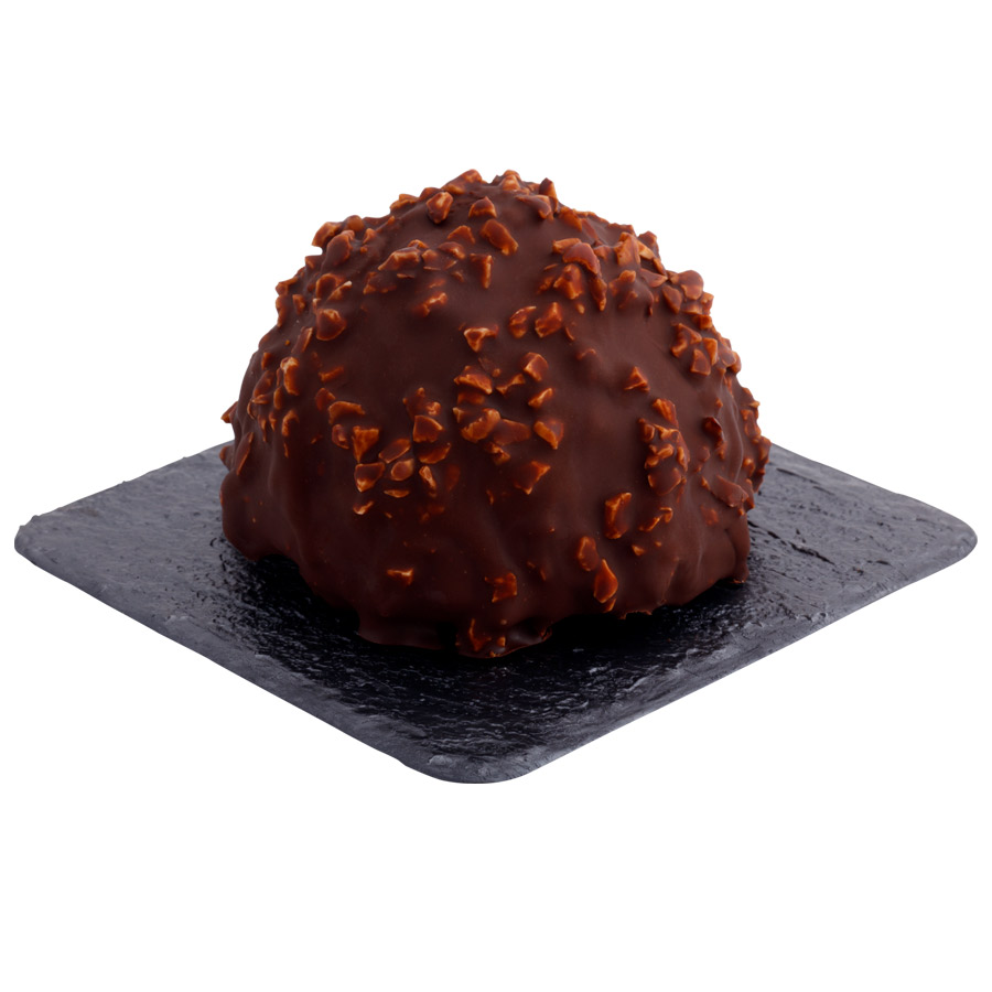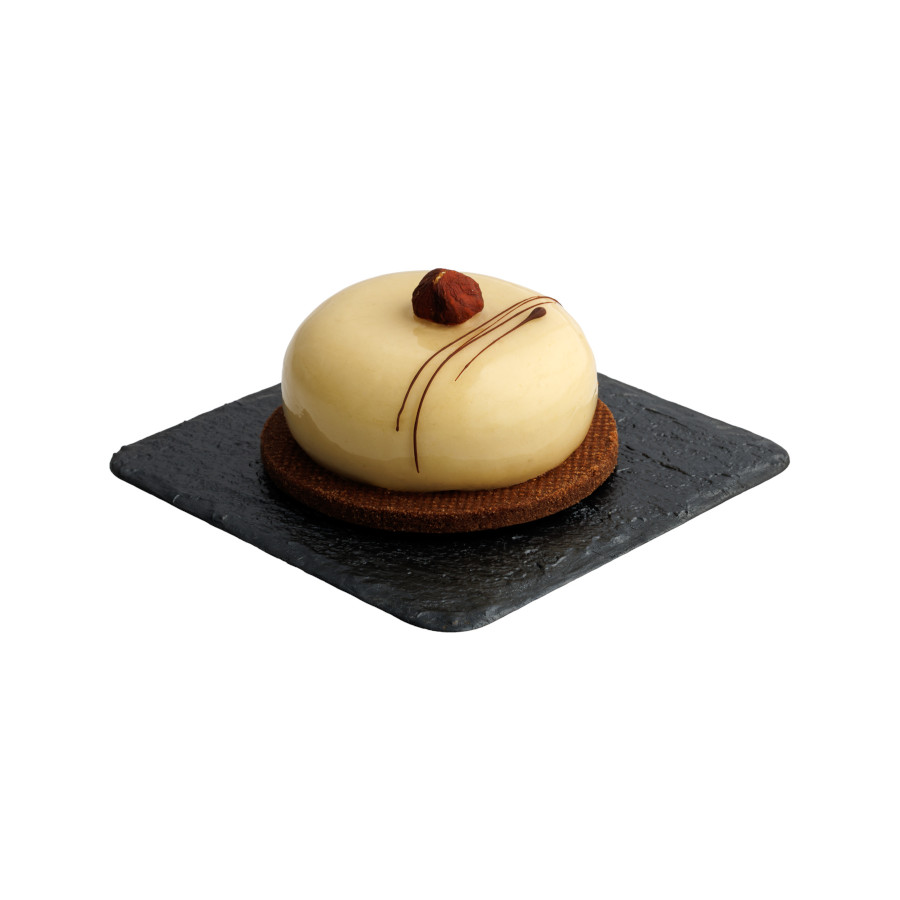 Un croccante biscotto al cacao e nocciola, due strati di mousse al cioccolato e nocciola, ricoperte da glassa alla gianduia.